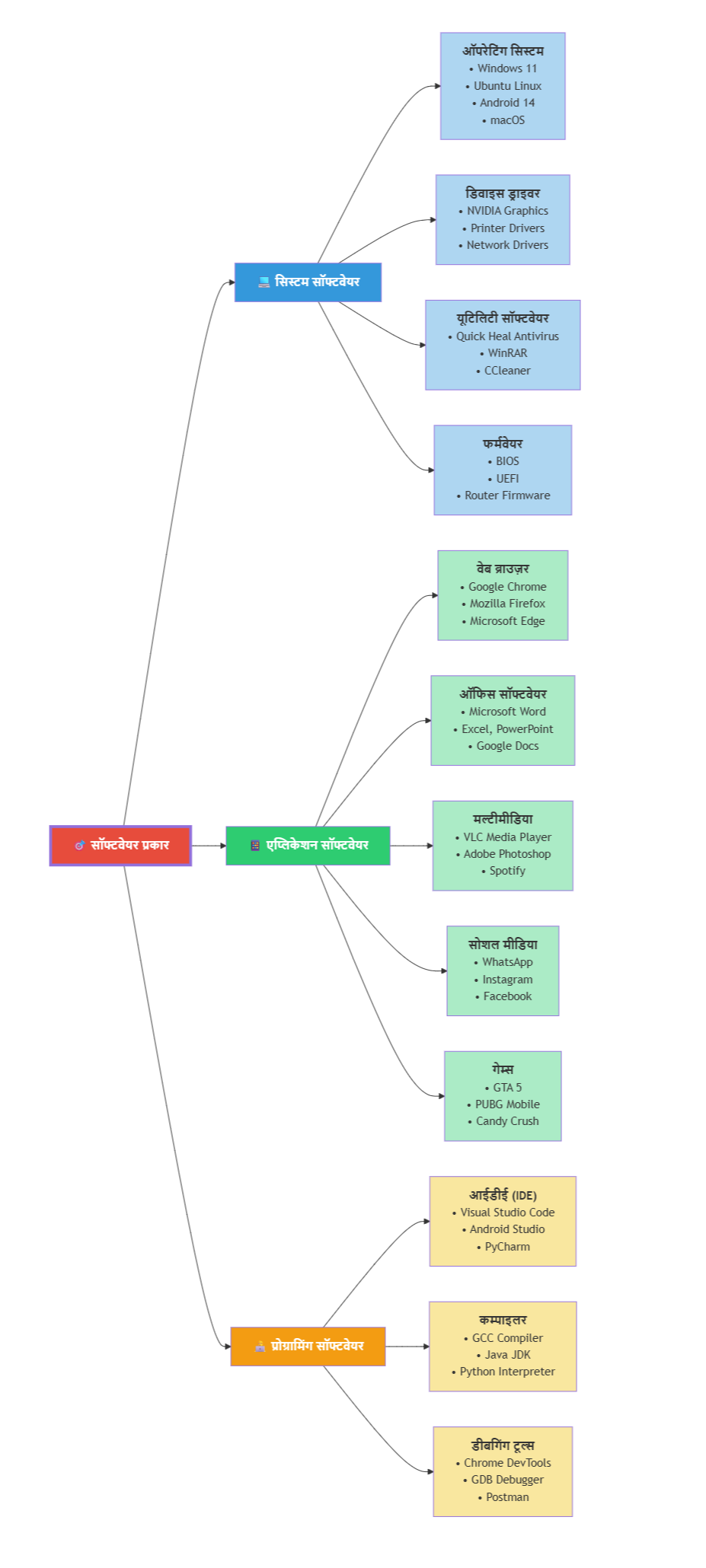 Output Devices: These send information out from the computer. Examples: Monitor (मॉनिटर), Printer (प्रिंटर), Speakers (स्पीकर्स).